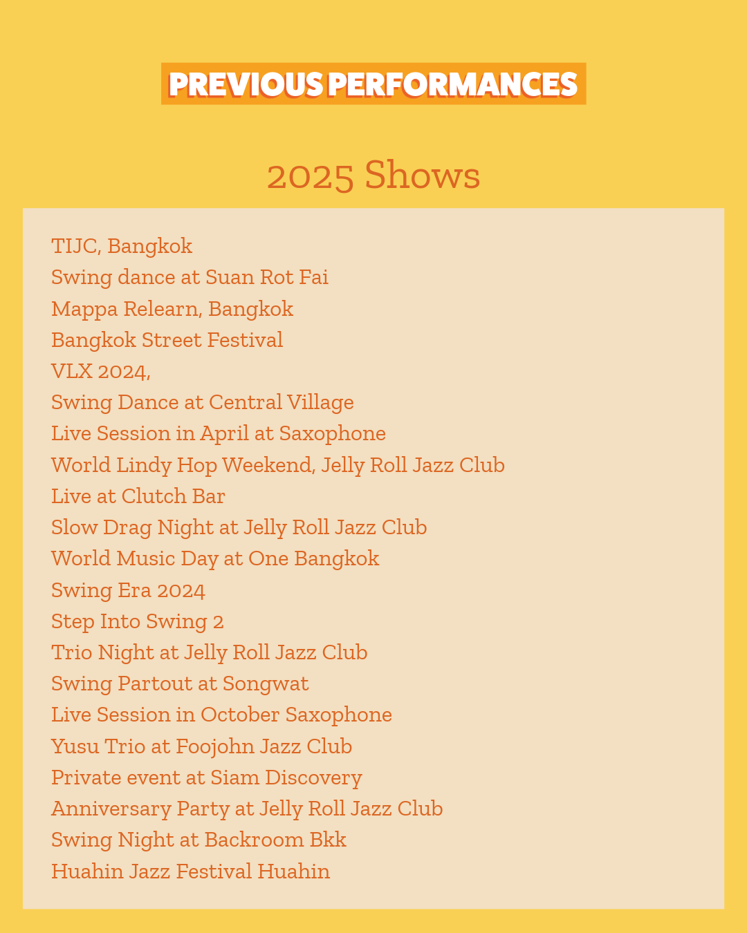 Bangkok's top vintage band, the Yusu Jazz Band are firmly established at home and internationally playing Swing and the Hot Jazz of the 1920s, 30s and 40s. Featuring music from composers such as Duke Ellington, Benny Goodman and Count Basie.